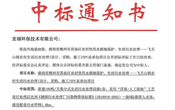近日,湖南宏福环保股份有限公司全资控股子公司—宏福环保技术有限公司成功中标湖南省郴州市苏仙区农村饮用水源地保护、生活污水治理—飞天山镇农村生活污水治...